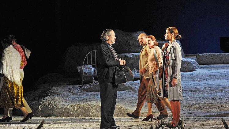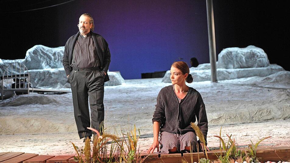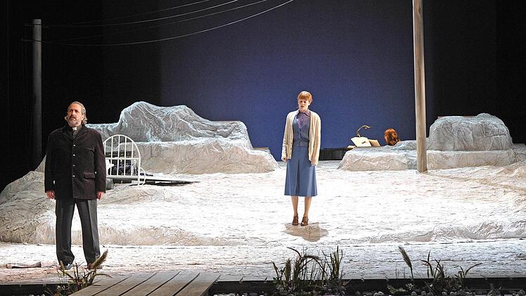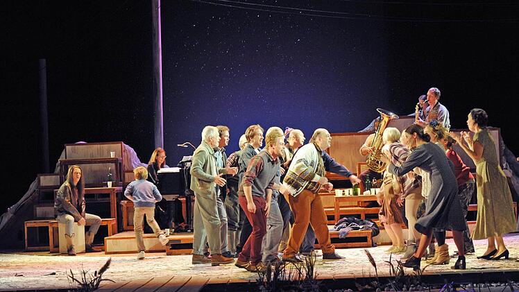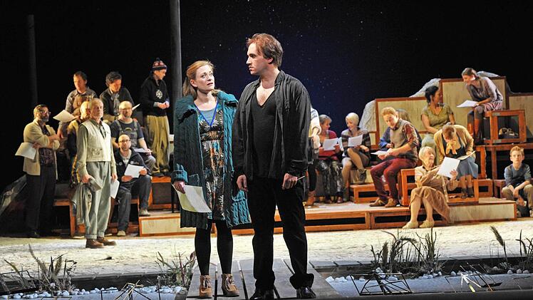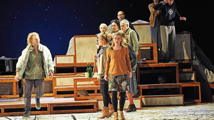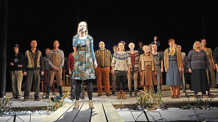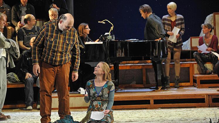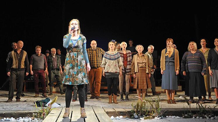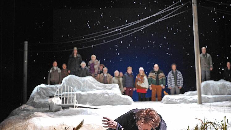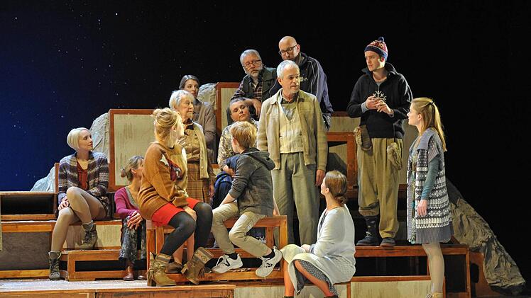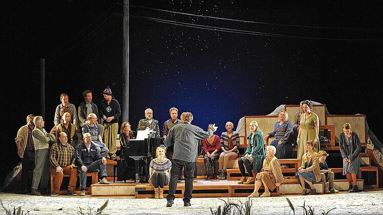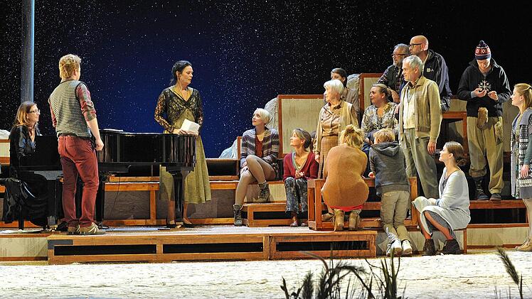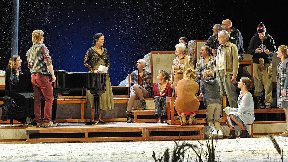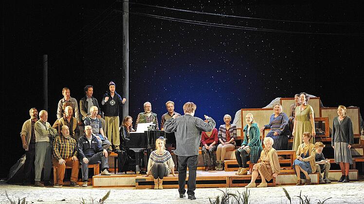 So tat es jedenfalls das Coburger Premierenpublikum am Freitag, nachdem es erst gar nicht mehr aufhören wollte zu applaudieren, zu danken für diese Bühnenrealisierung von Kay Pollaks Film "Wie im Himmel". Das haben Schauspielchef Matthias Straub und die Leiterin des Chores "Unerhört", Antoinetta Bafas geschafft. Und der vom ersten Moment an in märchenhaftem Gestus verzaubernde Bühnenraum von Till Kuhnert, der vom Premierenpublikum beim ersten Heben des Vorhanges mit erstauntem "Ohh" gewürdigt wurde: Es schneit unablässig über den glitzernden Hügeln vor blau leuchtender nordischer Nacht.