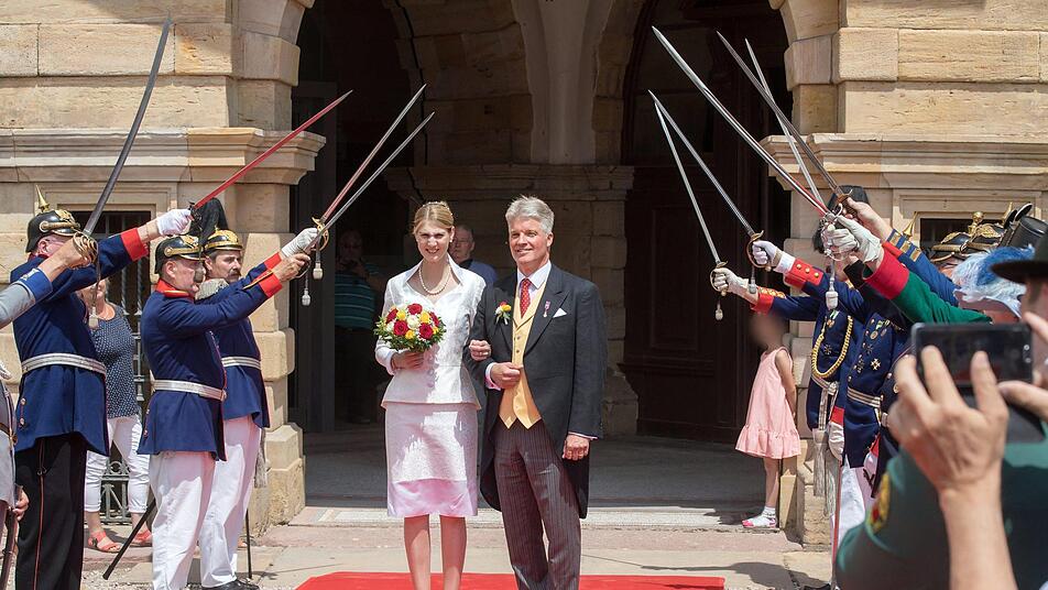 Rund hundert Menschen hatten sich vor dem Schloss, das einst im Besitz der Familie Sachsen-Coburg und Gotha war, versammelt, um das frischgebackene Ehepaar zu begrüßen. Darunter waren auch Vertreter verschiedener Vereine in historischen Uniformen, die für das Paar ein Spalier bildeten. Die Trauung hatte Gothas Oberbürgermeister Knut Kreuch (SPD) vorgenommen.