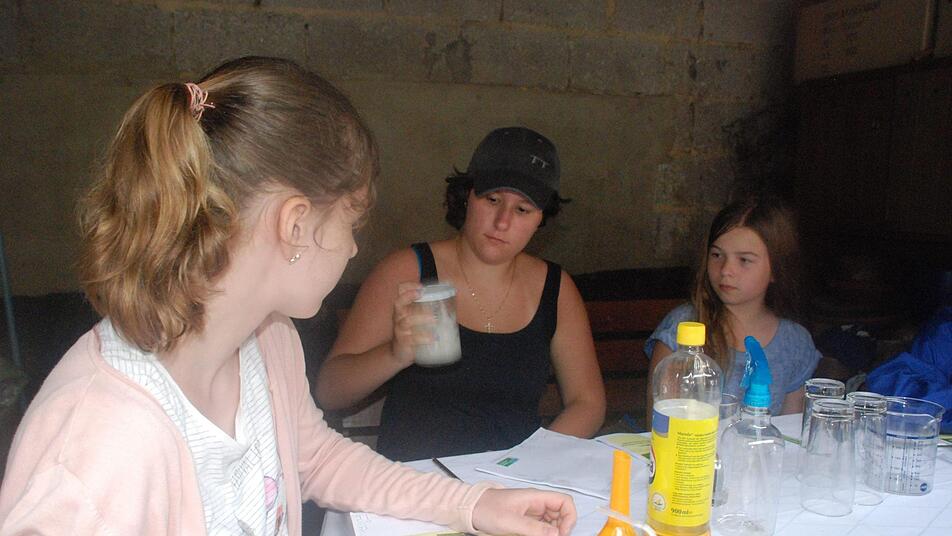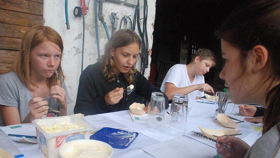 An vier verschiedenen Stationen im Innenhof teilt Gudrun Möckel Arbeitsaufträge aus. Die Sechstklässler müssen jetzt zeigen, was sie bereits gelernt haben oder selbst mit Milch experimentieren. Während die einen ausprobieren, wie das Homogenisieren funktioniert, dürfen andere den Unterschied zwischen Supermarkt- und Bauernhofeis erschmecken. Und, wer hätte es gedacht: Das Supermarkteis mit seinem wesentlich höheren Zuckeranteil hat auch seine Fans. Was steckt alles in der Milch und wo ist der Unterschied bei den verschiedenen Sorten? Akribisch genau lesen die Zwölf- und Dreizehnjährigen das Kleingedruckte auf den Packungen und testen Schluck für Schluck. Der Unterschied zwischen der pasteurisierten Kunzelmann-Milch und der Bio H-Milch aus dem Coburger Milchhof überrascht viele. Ihr Resümee: "Wir hätten gar nicht gedacht, dass Milch so anders schmecken kann."
