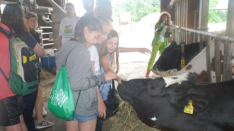 Gestärkt und wissensdurstig kamen die Schüler schließlich am Stall an, in dem nicht nur Familie Kunzelmann, sondern auch 80 neugierige Kühe auf sie warteten. Thomas Kunzelmann, der seinen Betrieb von der konventionellen Haltung derzeit auf biologisch umstellt, überraschte die Jugendlichen mit Zahlen: 40 Kilogramm Futter und über 100 Liter Wasser braucht eine Kuh am Tag, um etwa 25 Liter Milch geben zu können. Dafür staunte der Landwirt nicht schlecht, als die Schüler ihm problemlos die vier verschiedenen Mägen einer Kuh benennen konnten.