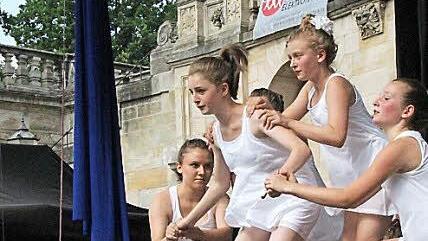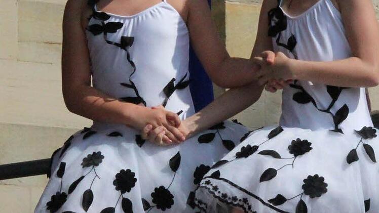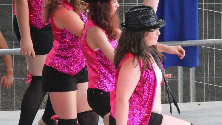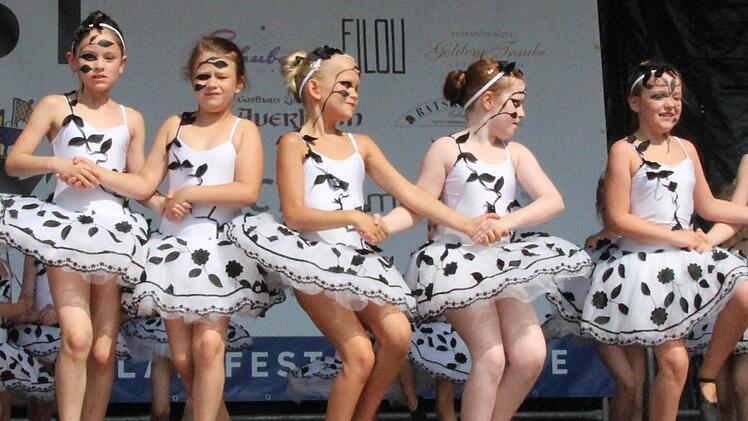 "Das kann man doch den Kindern nicht antun!", wunderte sich eine Besucherin auf den Arkaden. Wohl war: Schon beim ganz normalen Rumstehen auf dem Schlossplatz kam man am Sonntagnachmittag ins Schwitzen. Aber die Kinder auf der Showbühne hielten eisern durch - schließlich hatten sie lange und intensiv für ihre Auftritte geübt. Und wie gewohnt gab es keine Pause im Programm, wie am Schnürchen trat die eine Gruppe ab und die nächste auf.