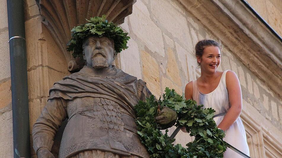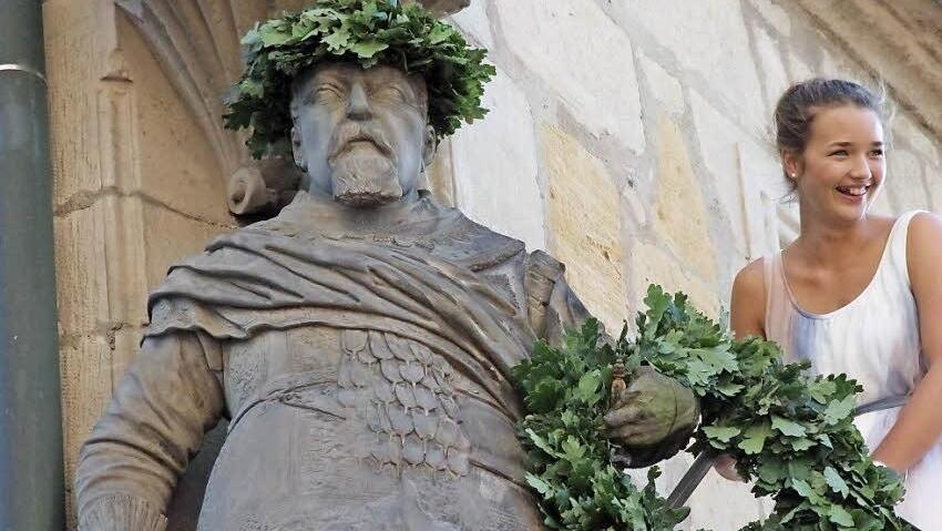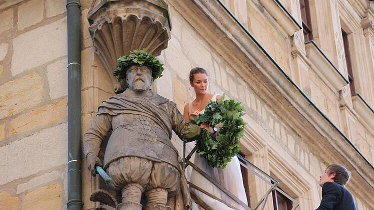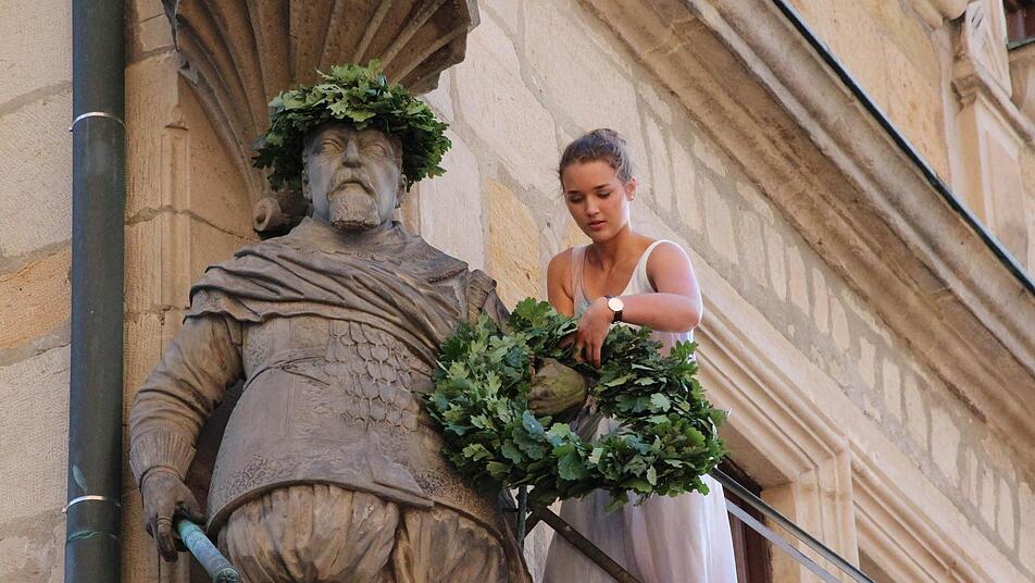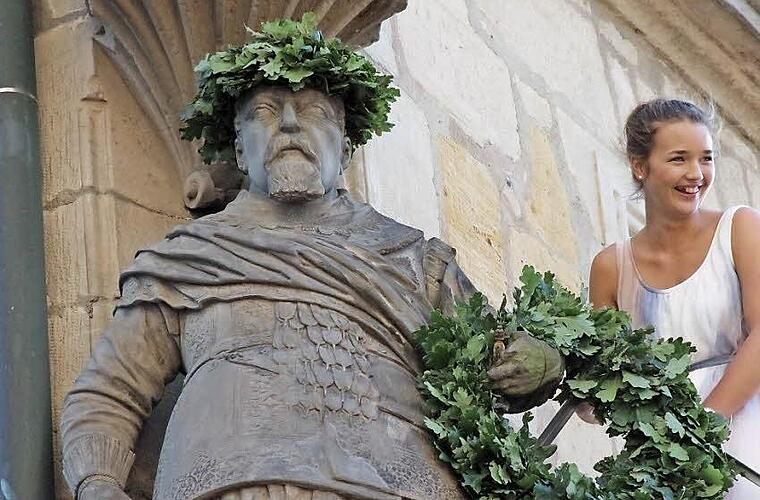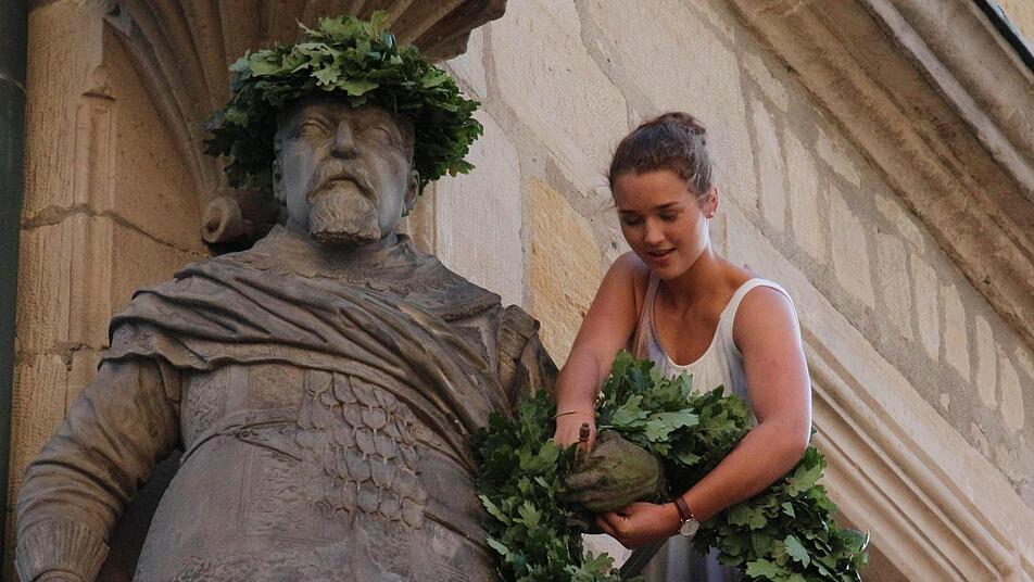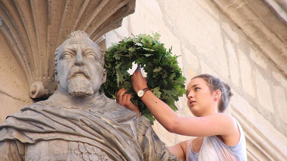 Martha Frittrang hatten die Schüler der Q11 in diesem Jahr für diese Aufgabe gewählt. Denn mit der Bekränzung der Statue ehren die Casimirianer seit dem 19. Jahrhundert Herzog Johann Casimir, der die Schule am 3. Juli 1605 gründete.