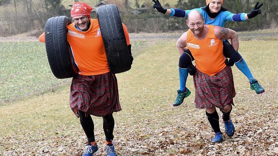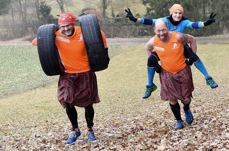 Oberstes Ziel ist es, gemeinsam durchs Ziel zu kommen. Fairness wird groß geschrieben. "Wer nicht ganz so fit ist, wird mit durchgeschleppt", prophezeit Sonnefeld, der bei der nächsten Runde seine Freundin Tanja gleich mal Huckepack nimmt und den Hang hoch trägt - im Schottenrock und oberkörperfrei versteht sich. "Hauptsache, wir bleiben unter vier Stunden", lacht der erfahrene RunningBros-Läufer.