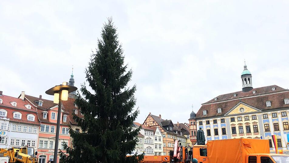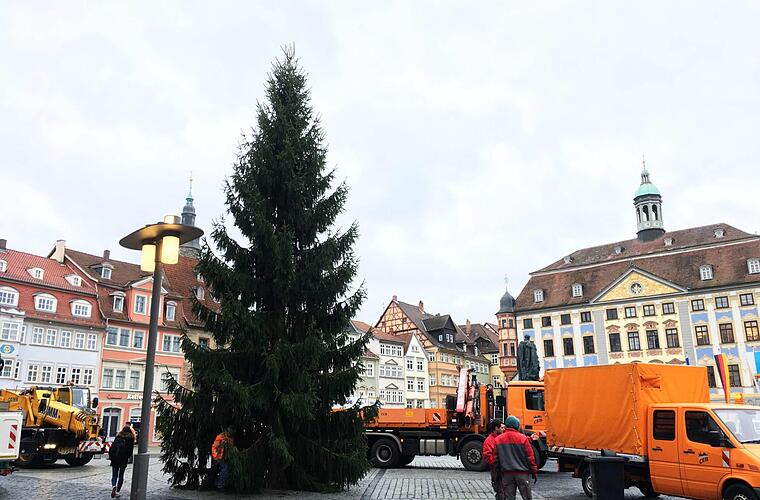 Der Coburger Weihnachtsbaum hat seine Fahrt von Mönchröden gut überstanden und seinen Platz auf dem Markt gefunden.