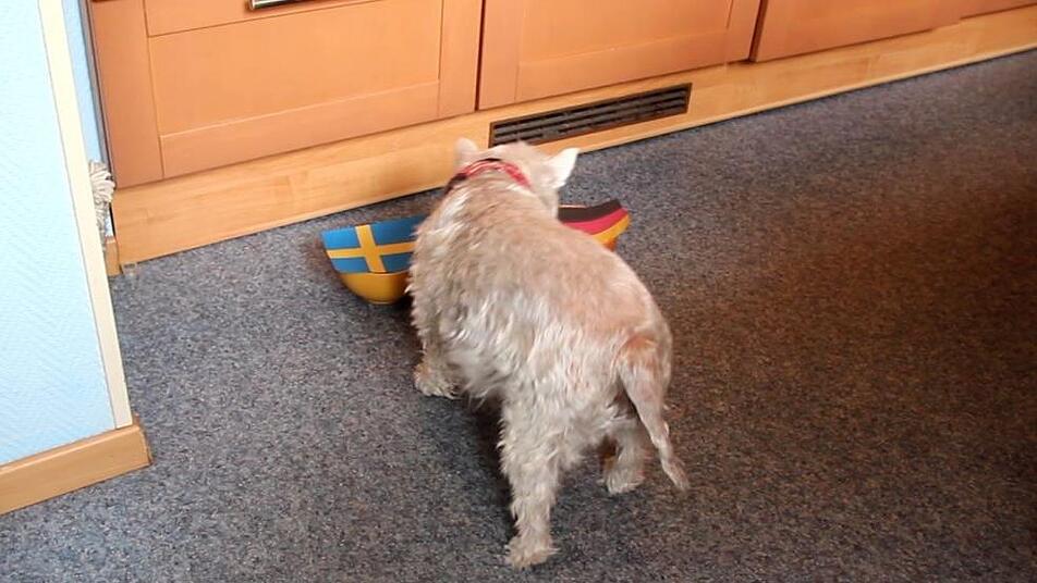 Als Sunny auf die beiden Futternäpfe, abgedeckt mit den Flaggen der Kontrahenten, zuläuft, rutscht dem deutschen Fußballfan erst einmal das Herz in die Hose. Zielstrebig visiert sie den Schweden-Napf an. Vorrunden-Aus als amtierender Weltmeister? Kann nicht sein! Einmal kurz geschnuppert, dann wendet sich Sunny doch noch zum deutschen Napf, stupst die Papierflagge beiseite und schleckt die Schüssel aus. Die Entscheidung ist gefallen.