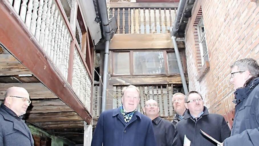 Die Ketschengasse 42 ist so ein Fall: Ein klassisches Einzeldenkmal mit Fachwerk unterm Putz und einem Innenhof mit Laubengang. Ohne Fördermittel nicht zu sanieren - zumindest nicht so, dass es sich für einen Vermieter rechnet, sagt Willibald Fehn. Der kaufmännische Geschäftsführer der Coburger Wohnungsbaugesellschaft erläuterte dem Staatssekretär Gerhard Eck, mit welchen Schwierigkeiten die Wohnbau in der Ketschenvorstadt kämpft.