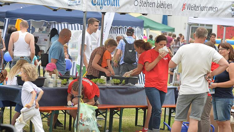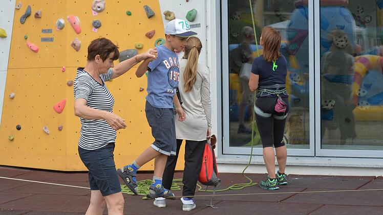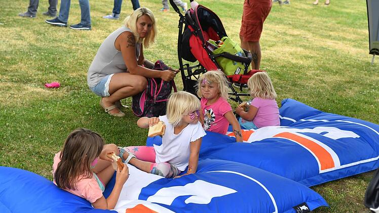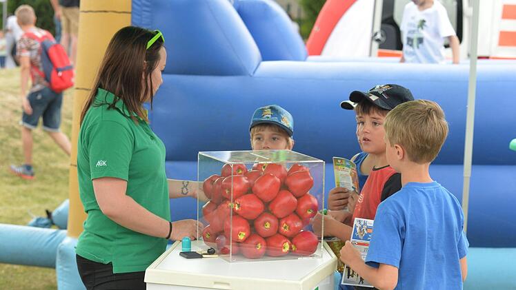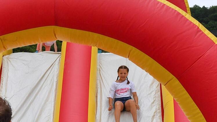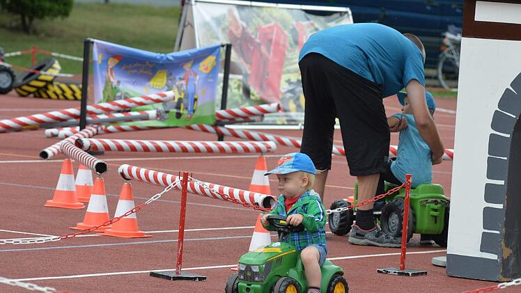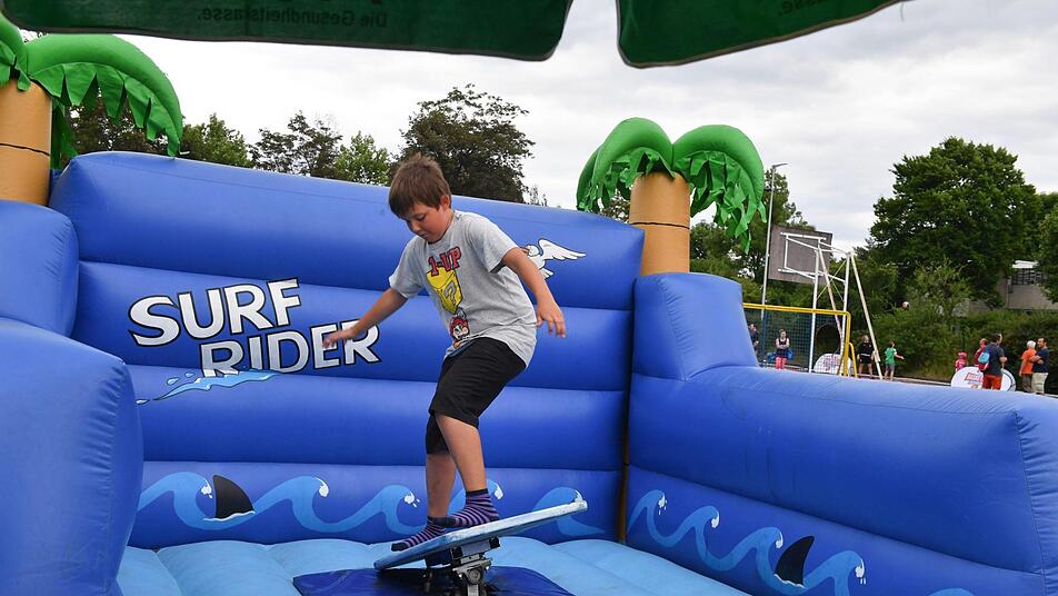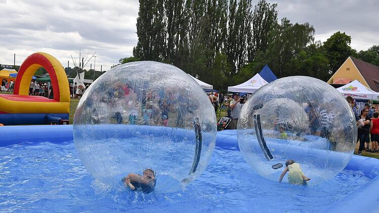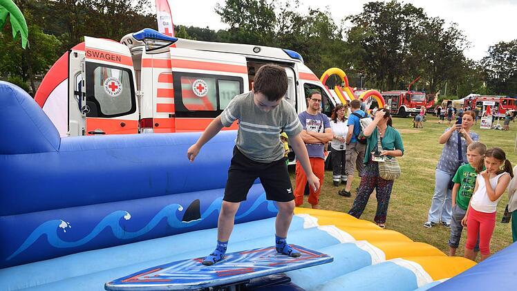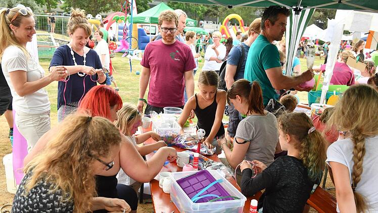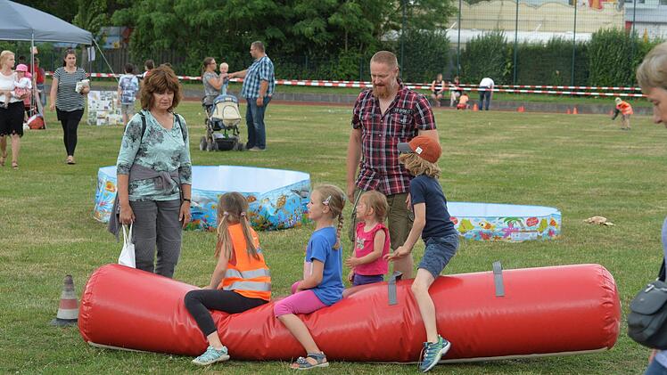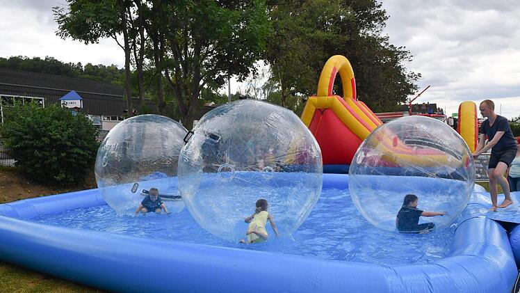 Ob Riesenhüfburg oder Hula Hoop-Reifen, Becher Stapeln oder Schach spielen, Traktor fahren oder Feuer löschen, ob Wunden schminken oder Schmetterlinge ins Gesicht malen, im Wasserball herumrollen oder Balance halten beim Surfen, die Besucher des Familientages kommen alle auf ihre Kosten. "Die Stimmung ist toll, das Wetter optimal", resümiert Christine Völker vom Stadtjugendring. Es freut sie, dass vor allem der Kleinkindbereich so gut angenommen wird. "Wir haben die Anregung aus dem vergangenen Jahr gerne aufgegriffen", sagt sie und schaut in Richtung Kletterwand. Davor ist der abgetrennte Bereich für die ganz Kleinen. Klara ist erst eineinhalb, aber es macht ihr offensichtlich riesig Spaß mit ihrem Papa in dem aufblasbaren Spielbecken herumzutollen.