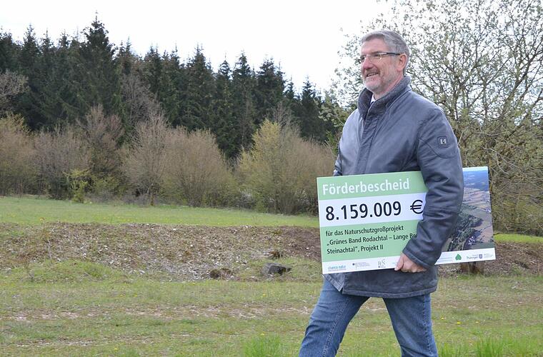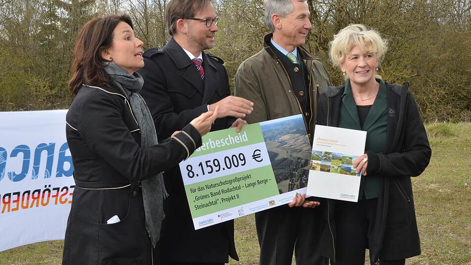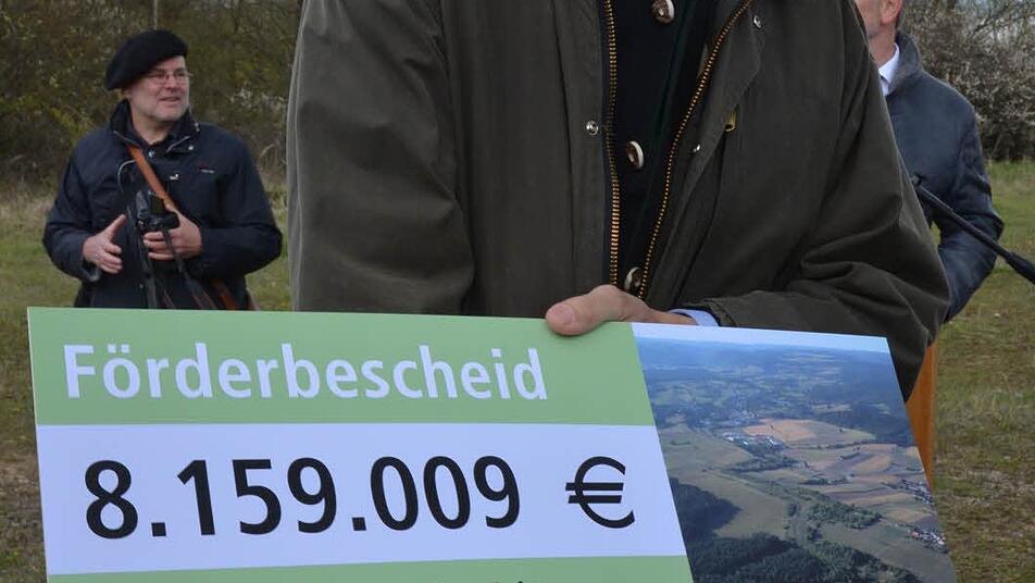 "Der Weg von der Idee eines Naturschutzgroßprojekts in unserer Region bis hin zur Umsetzung, dem so genannten Projekt II, dieser Weg war ein langer und steiniger Weg", sagte Coburgs Landrat Michael Busch (SPD) als er am Freitag in seiner Eigenschaft als Vorsitzender des Zweckverbands für das Projekt aus den Händen des Amtschefs im Bayerischen Umweltministerium, Christian Barth, den symbolischen Scheck über 8,159 Millionen Euro entgegen nahm.