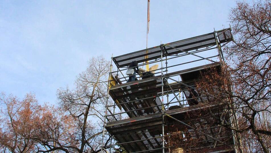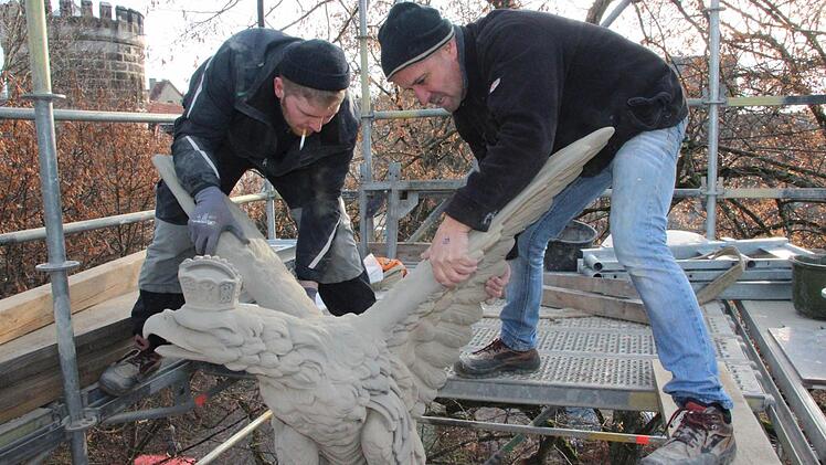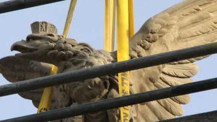 Während Arbeiter das äußere Gerüst abbauen, das während der Arbeiten den Blick auf das Denkmal verhüllte, schwebt der Adler am Kran über dem inneren Arbeitsgerüst unmittelbar neben der Säule. Christoph Klesse gibt das Zeichen, anzuheben, dann schieben seine Gesellen Michael Klesse und Johann Djatlov den Vogel hinüber zum Sockel. Zentimeter um Zentimeter sinkt der Sandsteinaar nach unten, den Blick unverwandt in Richtung Stadt gerichtet. Schließlich kann Johann Djatlov die Gurte lösen - der Adler hat seine Endposition erreicht.