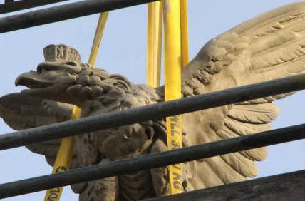"Der Adler war so fragil, dass ein Transport sehr viele Gefahren geborgen hätte", sagt Steinmetzmeister Christoph Kleese. Deshalb erhielt der Adler seine Verjüngungskur direkt auf dem Gerüst, unter der Einhausung, die das gesamte Denkmal einhüllte. Mit einer Mikropartikelstrahlung wurden Schmutz und Ablagerungen entfernt, die dem Sandsteinvogel schon eine dunkle Patina verliehen hatten.