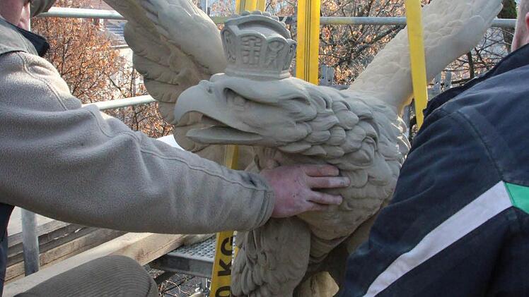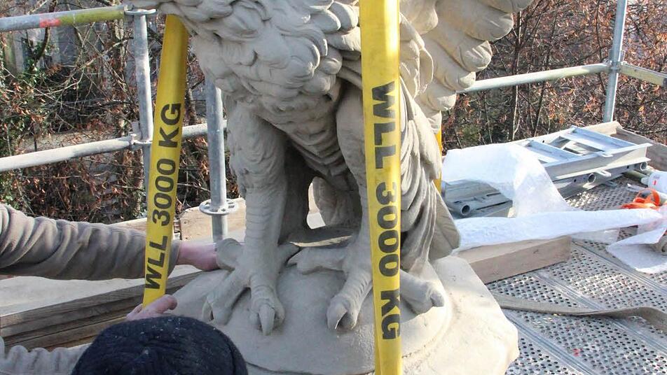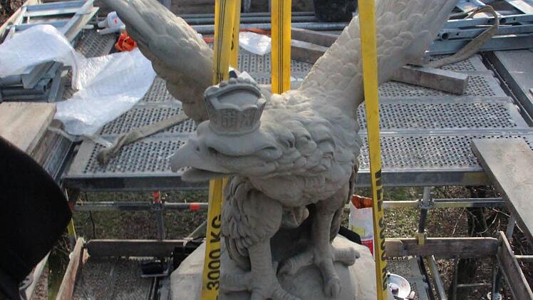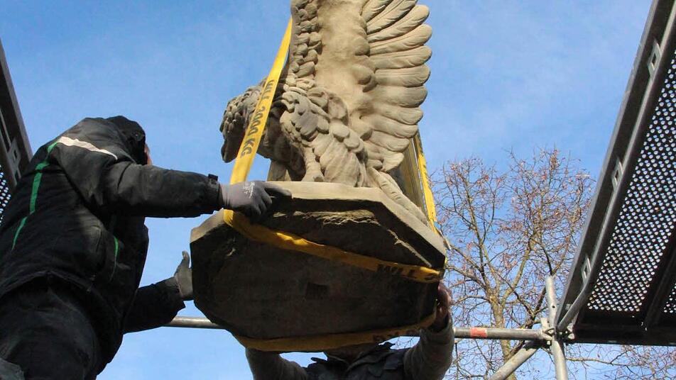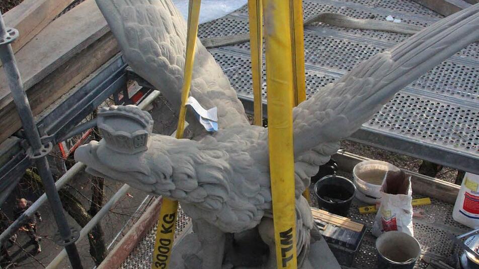 Der Adler mit den mächtigen Klauen ist aus einem einzigen Schilfsandsteinblock gehauen. Während er erhalten werden konnte, musste das Kapitell, auf dem er steht, nachgefertigt werden. Das Denkmal selbst bestand aus Zeiler Sandstein, erzählt Christoph Klesse.