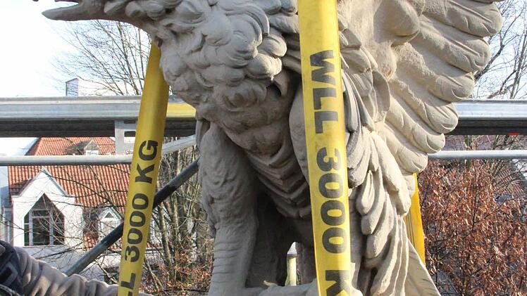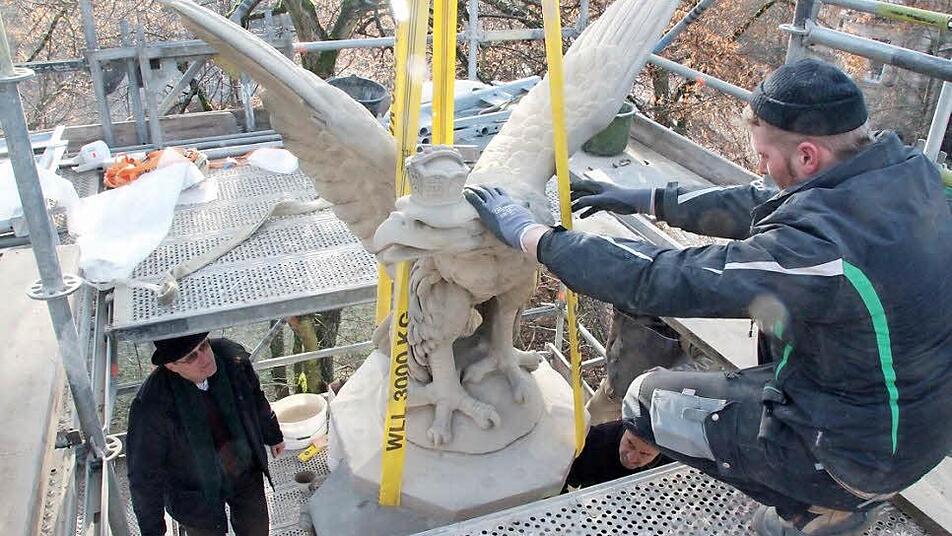 Weit weg war der Adler nie: Der rund acht Zentner schwere Sandsteinvogel überdauerte die Sanierung des Denkmals am Ernstplatz auf dem Gerüst. Seit gestern sitzt er wieder auf der Säule, die an den Deutsch-Französischen Krieg von 1870/71 erinnert.