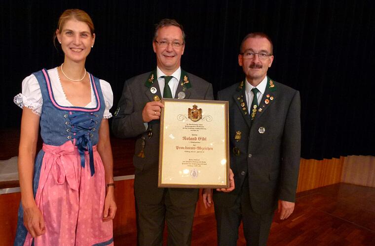 Höhepunkt der Ehrungen bei der Coburger Schützentafel war die Verleihung des Protektoratsabzeichens an Roland Eibl durch Prinzessin Stephanie von Sachsen-Coburg und Gotha. Oberschützenmeister Hans-Herbert Hartan würdigte in seiner Laudatio die hervorragenden Dienste Eibls um die Schützengesellschaft. Er ist 17 Jahre Mitglied und Schatzmeister. "Wer unsere Buchhaltung kennt, kann erahnen, welche Arbeit hinter diesem Amt steckt", sagte Hartan. Auf Eibl, der bereits mehrfach vom Bayerischen und Deutschen Schützenbund geehrt wurde, sei Verlass und die Schützengesellschaft habe ihm viel zu verdanken, so der Oberschützenmeister.