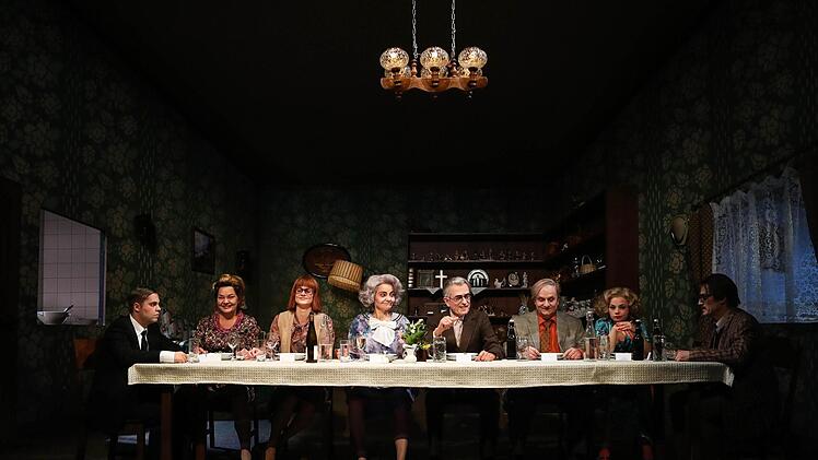 Großgrüngeblümelt bis unter die Decke, Schrankwand wie ein riesiges Brett vorm Kopf, und statt Perspektive gibt es nur noch rituell sich drehende Innenschau. Fränkische Schau aufs Kleinbürgerliche der 70er Jahre. Die 80er waren auch nicht anders. Und ob es heute anders ist, von der Dekoration des Lebens abgesehen, darf bezweifelt werden. Familie im engeren und im weiteren Sinne, fest verstrickt und verknotet in sich selbst. An großen Festen muss es sich erweisen, ob das Netz noch hält oder alles auseinanderfliegt.