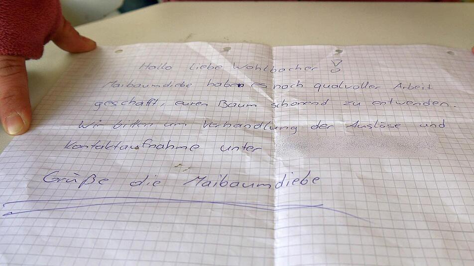 Harte Verhandlungen Die selbstbewussten Meederer hinterließen bei ihrem Diebstahl in der Nacht auf Donnerstag hingegen eine deutliche Spur: Einen handgeschriebenen Zettel mit einer Handynummer, über die die Auslöse auszuhandeln sei. 45 Bratwürste, 30 Liter Bier sowie drei Flaschen Weinbrand samt Cola waren es am Ende, die am Donnerstagnachmittag den Eigentümer wechselten. Natürlich, so gehört es sich, nur unter schwerem Stöhnen von Christoph Haas angesichts dieses schweren Verlustes: "Wenn wir noch mehr gezahlt hätten, wäre ja beim Maibaumfest gar nichts mehr übrig geblieben." Da musste Benjamin Otto als Verhandlungsführer der Meederer natürlich nur herzhaft lachen, schließlich ist er von seiner ursprünglichen Forderung ganz schön abgerückt, um die armen Wohlbacher nicht zu überfordern.