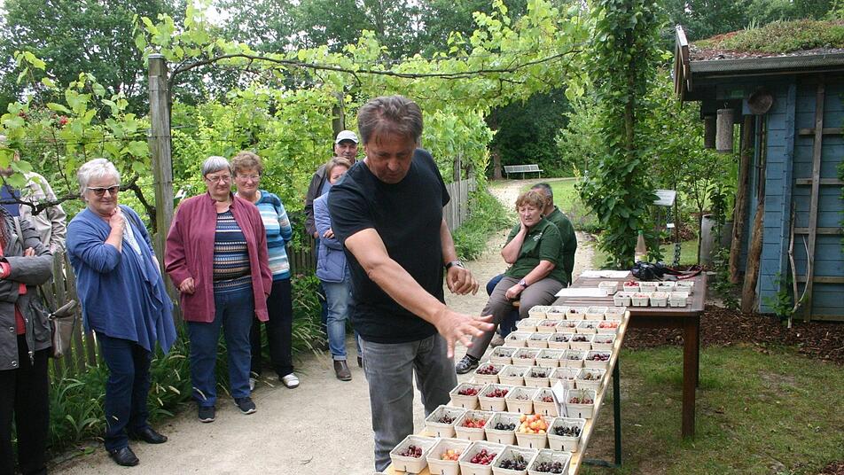 Sozusagen auf halbem Weg zwischen den Privatgärten in Scheuerfeld und Rödental lliegt der Obstlehrgarten des Kreises am Coburger Landratsamt. Dort präsentierte Kreisfachberater Thomas Neder h50 heimische Kirchsorten. Die Besucher lud er zu einer Verkostung ein, was gerne angenommen wurde. Neder konnte versichern: "Die Kirschen sind frei von Chemie". Ob die Früchte andere Bestandteile beherbergen, sollte nicht unbedingt ergründet werden.