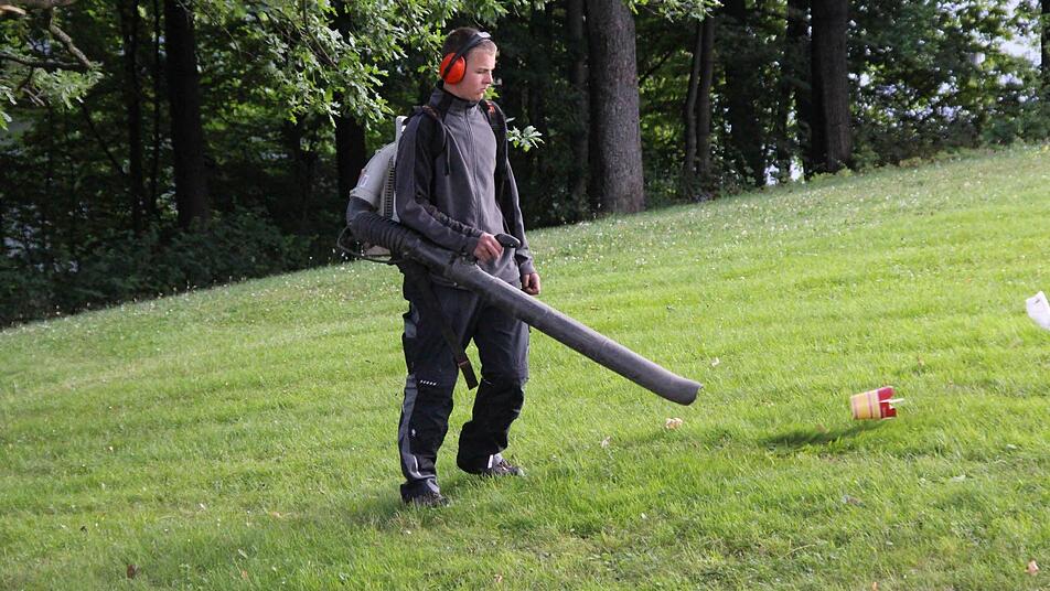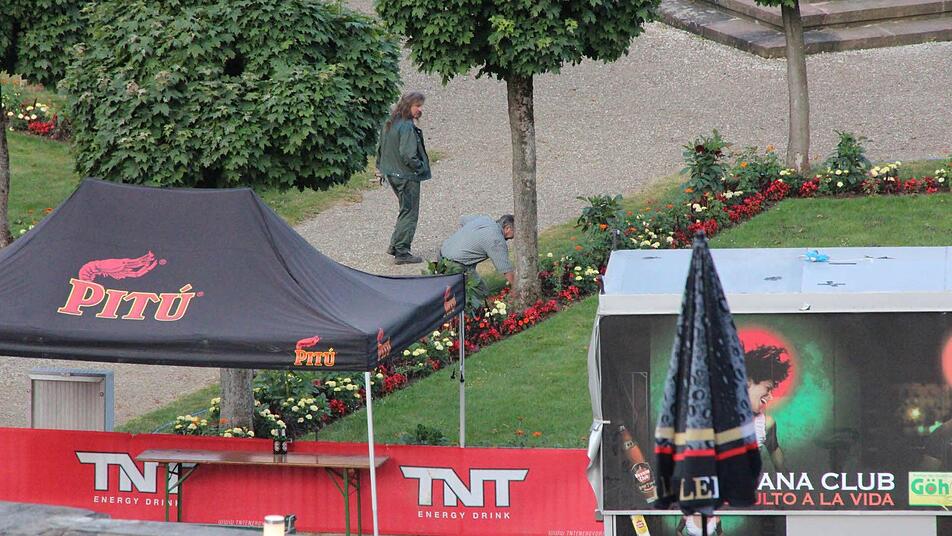 Doch wer schaut da noch hin, wenn nach 24 Uhr das Bühnenprogramm vorbei ist? Zwei Security-Leute sitzen auf der Bühne und schauen runter zum Schlossplatz, während Patrick Oppel den Laubbläser auf den Rücken schnallt. "Hier, der kleine Rosengarten, die Naturbühne und der Hofgarten bis zum Alfredsbrunnen und zum Ehrenmal", beschreibt Detlef Hoffmann das Einsatzgebiet. Er und Reiner Niermann werden sich um den Josiasgarten und das Rondell am Schlossplatz kümmern. Pascal Kornherr hat sich einen der Greifer und einen Müllsack geschnappt und beginnt, die Dinge einzusammeln, die der Laubbläser nicht bewegen kann.