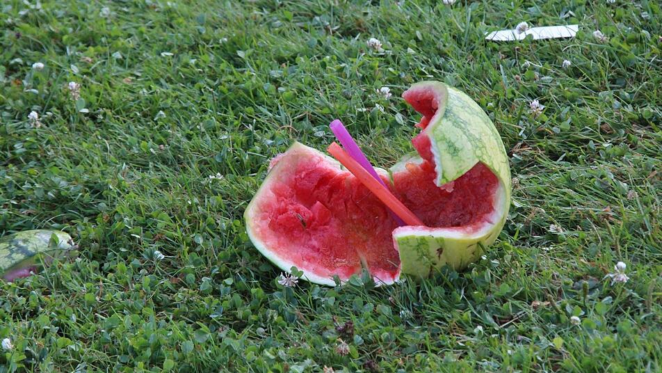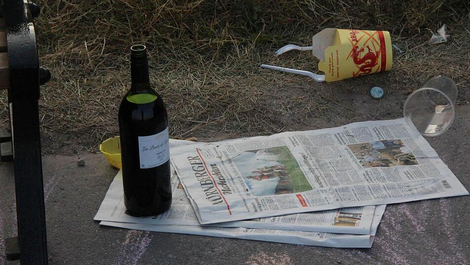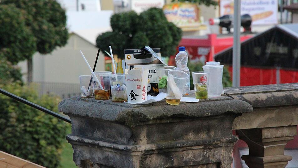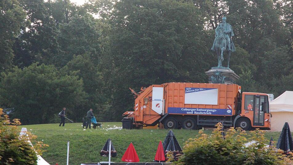 Am Reiterdenkmal Herzog Ernst II. teilt sich die kleine Gruppe. Die Azubis werden mit Gebläse und Greifern die Wiese rund ums Denkmal freimachen. Sie liegt voller Plastikbecher, dazwischen Pappteller, die Überreste einer Melone, etliche Limettenstückchen. Ein Trinkhalm klappert leise, als er wegrollt. Die beiden Mülltonnen direkt am Weg sind dagegen so gut wie leer. Im Gras finden sich auch kleine Likörfläschchen und die eine oder andere, die mal Hochprozentiges enthielt. Dabei dürfen in diesen Bereich, der zum Festival gehört, gar keine Alkoholika mitgebracht werden.