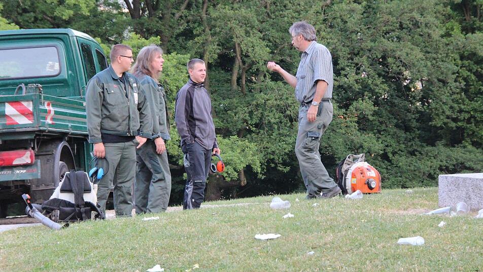 "Vor vier Jahren, als ich das letzte Mal dabei war, sah es schlimmer aus", stellt Detlef Hoffmann fest. Vor allem Scherben im Gras machten den Leuten vom Grünflächenamt zu schaffen. Die müssen nämlich einzeln herausgelesen werden - eine langwierige Fitzelarbeit. Die Plastikbecher und Pappteller lassen sich da leichter wegschaffen.