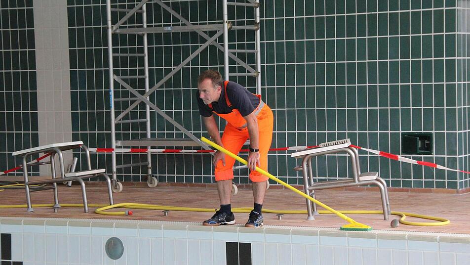 Sein Chef erklärt: "Weniger Chlor, heißt weniger aggressives Wasser, was besonders fürs Babyschwimmen oder andere Kurse sehr vorteilhaft ist." Oben schießt aus einem Schlauch derweil Wasser in das große Becken. "Es dauert zwei Tage bis die rund 400 Kubikmeter im Becken sind und dann nochmal drei Tage bis die Temperatur von 28 Grad erreicht ist", erklärt Latyschev. Er greift sich einen Schrubber und sucht seinen Kollegen Markus Ehrlicher. Gemeinsam gehen sie in den Außenbereich und bringen noch das große weiße Plantschbecken auf Hochglanz. Denn bis zur Wiedereröffnung am Montag muss alles tiptop sein.