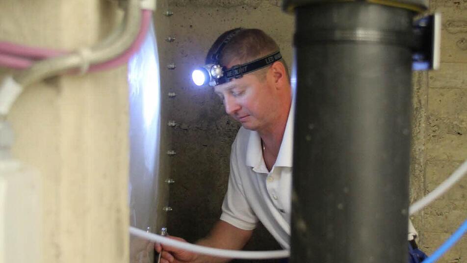 Viel mehr als nur Putzen "Wir lassen das Wasser ab, kontrollieren und reparieren die Fugen, warten die Technik, prüfen den gesamten Betriebsablauf und machen alles hygienisch rein", sagt Latyschev und geht die Treppen in den verzweigten Keller hinunter. Rohre, Hähne und blinkenden Displays dominieren hier das Bild und eine unerwartete Wärme treibt einem einige Schweißtropfen auf die Stirn. Der Schwimmmeister stoppt an zwei blauen Kästen auf denen er Chlorgehalt, pH-Wert und Redoxspannung ablesen kann.