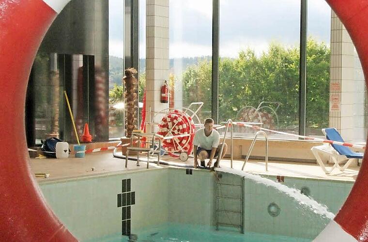Wo normalerweise Schwimmer ihre Bahnen ziehen oder Kinder im Wasser planschen, da sind zur Zeit nur leere Becken, und darin Männer mit Gummistiefeln, zu sehen.