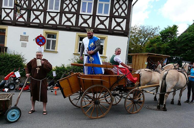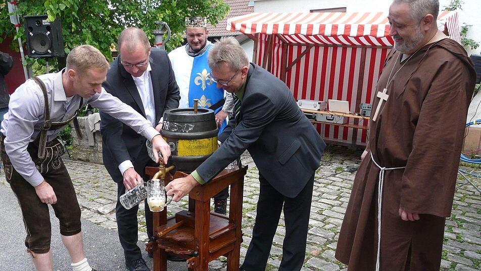 In einer Pferdekutsche kam auf den Markt "König Lou" und winkte majestätisch den Gästen zu. Das Gespann lenkte Silva Hirschner. Als Mönch zog Markus Weschenfelder nach der Kutsche einen kleinen Handwagen auf dem das Fass Freibier stand. Beide sind von der Faschingsvereinigung Meeder als die "Schmalzbuam" bekannt. Wie könnte es anders sein, hatte Andreas Lutz ein launiges Gedicht zur Eröffnung parat. Bürgermeister Bernd Höfer brauchte nur einen Schlag für den Bieranstich, wobei ihm seine Nachbarkollegen aus Weitramsdorf und Lautertal assistierten. Höfer bedankte sich allen Ausstellern und Helfern. Er verwies auf das erstmals 1125 erwähnte Marktrecht von Meeder, das mit dem Meedertag wieder belebt werden soll, was auch mit der zweiten Veranstaltung gelang. Bis in die späten Nachmittagsstunden saßen Gäste und Besucher beisammen.