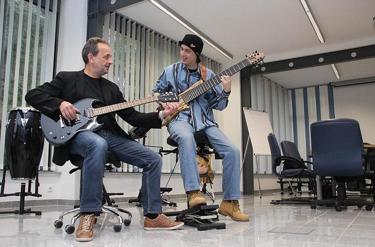 Zugegeben, die Stühle von Dieter Mey sehen etwas ungewöhnlich aus. Hohe oder tiefe, dünne Gestelle mit abgerundeter Sitzfläche und Armen mit merkwürdigen Halterungen daran. Wenn der Blick durch das große lichtdurchflutete Zimmer im Seßlacher Ortsteil Merlach schweift, sieht man Gitarren und ein Schlagzeug. Spätestens, wenn Igor Saavedra mit seiner schwarzen Tasche - die Konturen eines Instrumentes sind zu erkennen - den Raum betritt, wird klar, diese Stühle haben etwas mit Musik zu tun.