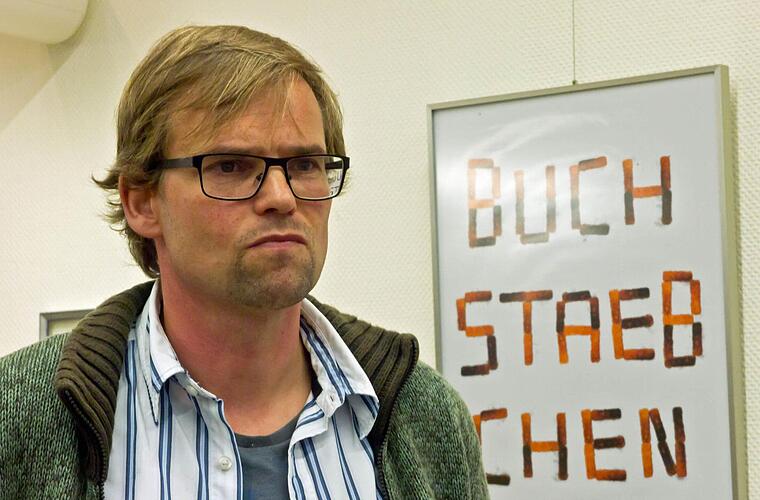 "Buchstaben - Fundstaben - Fehlstaben" hat Heß eine kleine Ausstellung genannt, die im Foyer und im Treppenhaus der Stadtbücherei zu sehen sind.