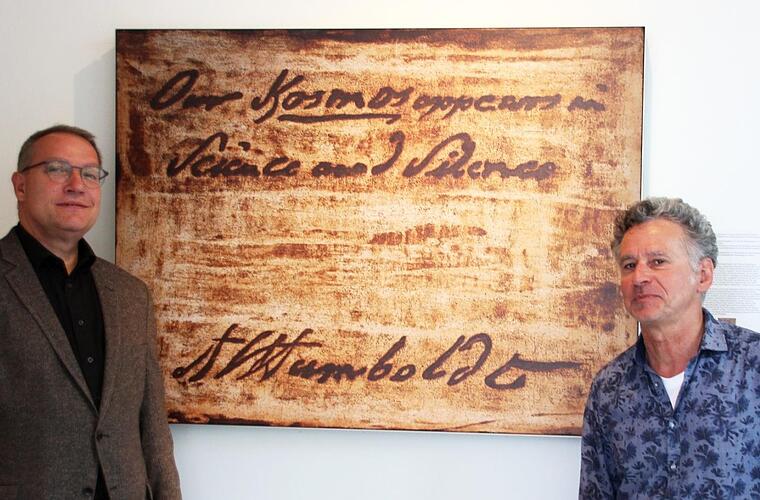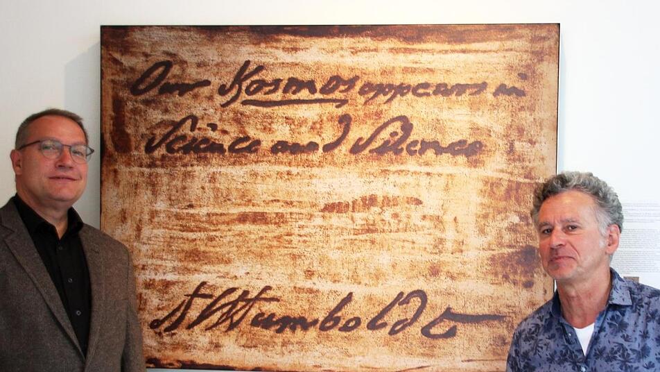 Der Bildende Künstler Benno Noll lebt in Coburg, agiert aber weiter ausgreifend, national, auch international. An größeren Geistes- und Gedankenzusammenhängen interessiert, beteiligte er sich 2018 am Wettbewerb zur Gestaltung des Humboldt Forums. Sein wie zu erwarten dort nicht angenommener Beitrag symbolisiert jetzt - dank der Sachspende der VR-Bank - den Geist, der auch das Coburger Naturkundemuseum umtreibt. Das Leuchtbild, Modell für die geplant vier mal vier Meter große Wandgestaltung, wurde jetzt der Öffentlichkeit vorgestellt.