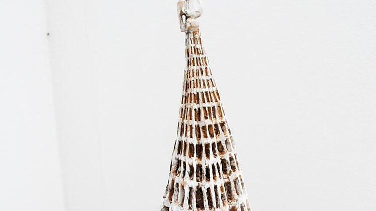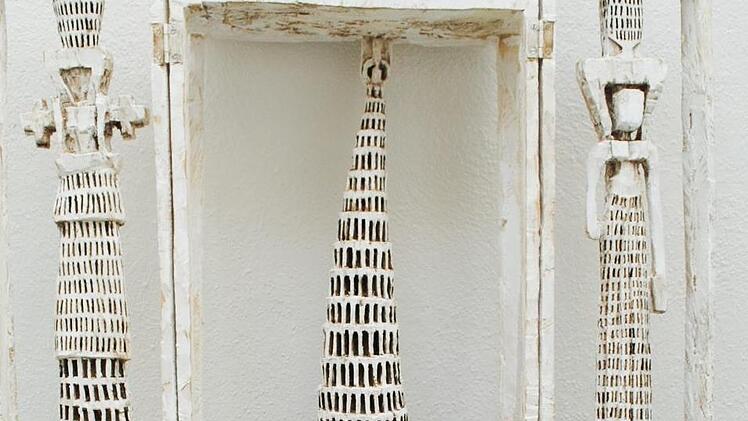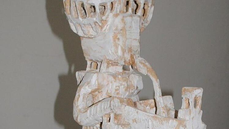 Ob "nur" einen Meter hoch oder Menschengröße überragend, Klaus Hacks feinteilig gegliederte Holzskulpturen, ebenso aber auch seine skurrilen Figuren, tragen archaische Urzeit und Science Fiction in sich. In aufwendiger Schnitzarbeit jeweils aus einem Baumstamm geholt, steigt fensterreich Etage über Etage. Doch so miniaturhaft geformt die Bauten im Detail auch sind, so monumental wirken sie. Klaus Hacks Auseinandersetzung mit "Babel - Figur und Turm", wie die Ausstellung überschrieben ist, kreist um das Streben des Menschen ins Himmelhohe, dessen Sehnsucht über sich selbst hinaus, unmittelbar damit verbunden den Hang zur Selbstüberhebung, zum Maßlosen.