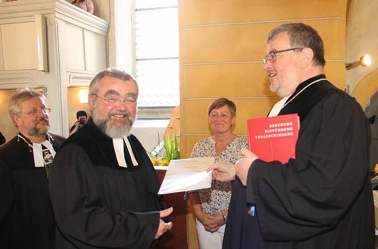 Er ist gefunden Der neue Geistliche, Pfarrer Wolfgang Leikert, wurde von Dekan Christoph Liebst offiziell, im Beisein einer Abordnung aus dem Dekanat Uffenheim und aus Geistlichen der Nachbargemeinden, die die Vertretung während der Vakanz übernommen haben, in sein Amt eingeführt.