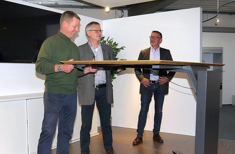 "High One" ist ein Gemeinschaftsprojekt des Coburger Landes. Leuwico verwirklichte den Tisch gemeinsam mit den Konstrukteuren der Firma Kontec aus Coburg, die das Innenleben der Höhenverstellung entwickelte. "Anderthalb Jahre haben wir an diesem Projekt gearbeitet", erzählt Ulrich Hofmann, Geschäftsführer bei der Firma Kontec. Die große Herausforderung dabei sei es gewesen, die gesamte Verstelltechnik in einer möglichst schmalen Säule unterzubringen. Denn die Kräfte, die dort wirken, erklärt Hofmanns Geschäftsführer-Kollege Martin Pechtold, seien enorm. Da brauche man normal eher viel Platz. Alleine eine gute Tischplatte wiegt bis zu 60 Kilo - dazu kommt noch all das, was heute zu einem Büro-Arbeitsplatz gehört: Computer, Bildschirm und noch viel mehr. "Das alles muss man mit vier Fingern bewegen können", schildert Pechtold, was man sich bei Leuwico zu Beginn der Entwicklung vorgestellt hatte.
