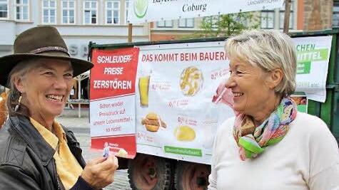 Was macht die Kuh auf dem Marktplatz? Ein Becher frische Milch, ein Stückchen Coburger Käse locken zum Stelldichein. Die Coburger Bauern wollen auf ihre Situation aufmerksam machen und mit den Bürgern in Dialog treten. Gerne wären sie an einem der Markttage gekommen, doch da ist kein Platz für ihr Anliegen. Deshalb standen sie am Donnerstag mutterseelenallein am Albertsdenkmal und passten die Passanten ab. Sie ernteten viel Verständnis und jede Menge Unterschriften, mit denen die Coburger ihre Solidarität bekundeten. Die Bauern fordern, dass regionale Lebensmittelerzeugung durch die bayerische Verfassung gesichert wird, ein striktes Verbot von Rabattaktionen bei Grundnahrungsmitteln, kartellrechtliche Maßnahmen gegen die Übermacht der großen deutschen Handelskonzerne, eine stärkere Unterstützung für die bayerischen Erzeugerorganisationen und eine klare Kennzeichnung von bayerischen Lebensmitteln.