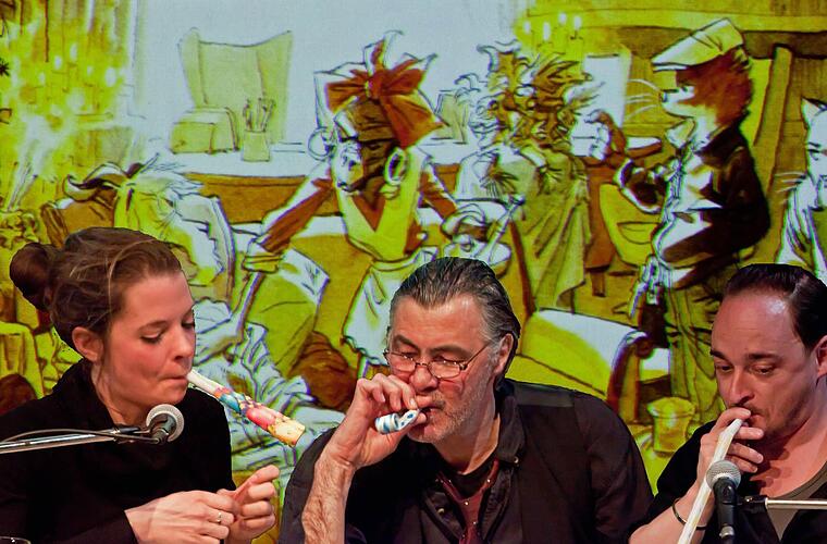 Live-Musik In der Reithalle präsentieren Anna Staab, Sebastian Pass und Helmut Jakobi in der Reihe "Freistaat Coburg" den Comic als pointierte Krimi-Lesung mit Live-Soundtrack. Den liefert "Freistaat"-Macher Michael Götz als klangmalerisch improvisierender Pianist und einfühlsamer Begleiter. Mit souliger Stimme steuert zudem Susann Karadah wirkungsvoll platzierte vokale Akzente bei - eine kleine Entdeckung.