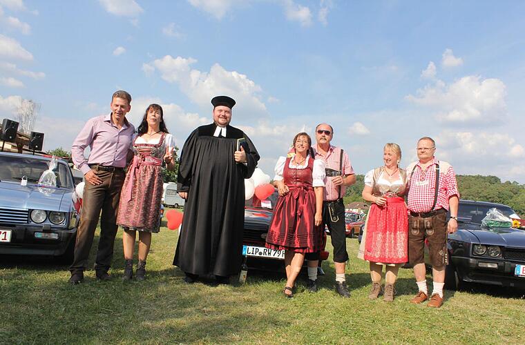 Drei Ehepaare teilen eine Leidenschaft: die Verbindung zum Ford Capri. Seit Samstagnachmittag haben sie eine gemeinsame Erfahrung mehr: Sie erhielten den kirchlichen Segen für ihre Liebesbeziehung zum jeweiligen Partner, den rechtlichen Trauschein hatten die Eheleute schon seit vielen Jahren in der Tasche.