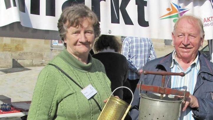 So manches Schnäppchen war möglich. Das Ehepaar Heide und Wilhelm Braunschmidt hatte fast eine Komplettgarnitur zur klassischen Zubereitung Coburger Klöße im Angebot: Eine Kartoffelpresse und eine Kartoffelreibe. Ein Kartoffelsäckla aus grobem Leinen wäre sicherlich auch noch auf dem Schlossplatz aufzutreiben gewesen.