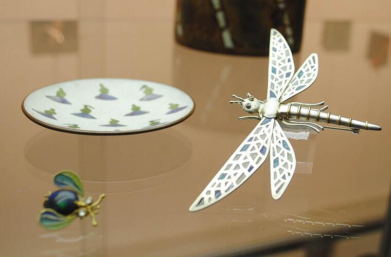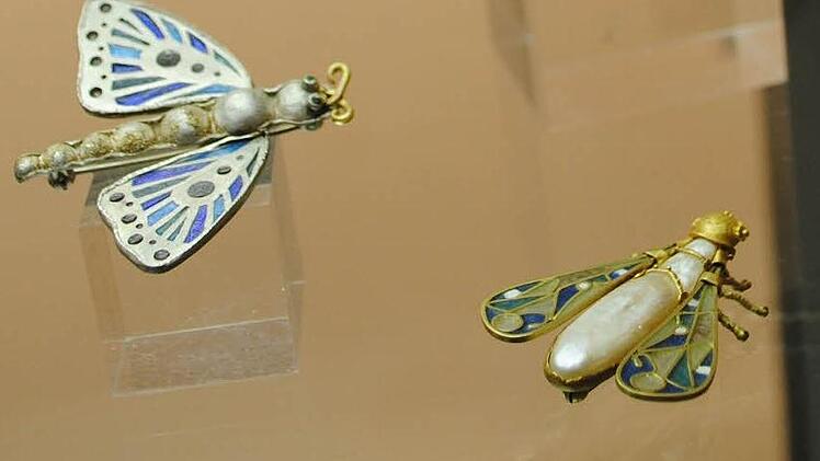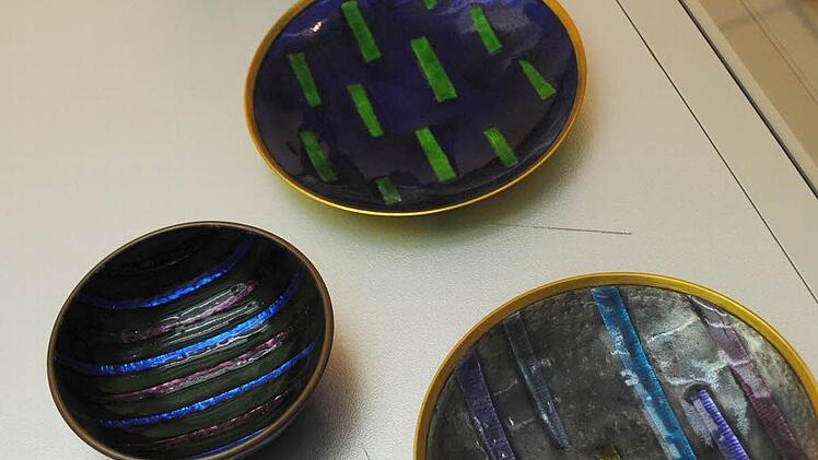 Die wunderbare Email-Welt der der 95-jährigen Vera-Marie von Claer-Crodel ist im Parterre des Coburger Kunstvereines zu sehen: Zauberhafte Libellen, schillernde Insekten kaum größer als ihre lebenden Vorbilder, dann aber auch abstrakte Gestaltungen, nur aus dem Farbeffekt des leuchtenden Emails heraus lebend.