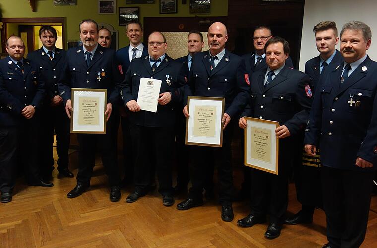Ehrungen: Holger Taubmann (staatliches Ehrenzeichen für 25 Jahre aktiven Dienst), Peter Schlag, Matthias Schneider (Jahresspange für zehn Jahre), Kai Heinlein, Günter Heubner (20).