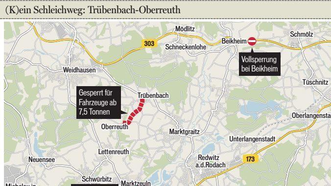 Die neue Beliebtheit der sonst nur im lokalen Verkehr genutzten Straße hat ihren Grund im Baustellengeschehen in den Nachbarlandkreisen: Sowohl bei Beikheim (Landkreis Kronach) als auch Marktzeuln (Landkreis Lichtenfels) sind stark frequentierte Straßen gesperrt, so dass die Autofahrer auf Schleichwege ausweichen. Und einer davon, besonders für die Einwohner aus dem Eck Lettenreuth/Marktzeuln auf dem Weg Richtung Norden (Kronach) und Osten (Kulmbach), führt über Oberreuth, Trübenbach und Marktgraitz.