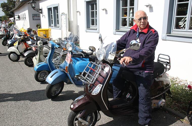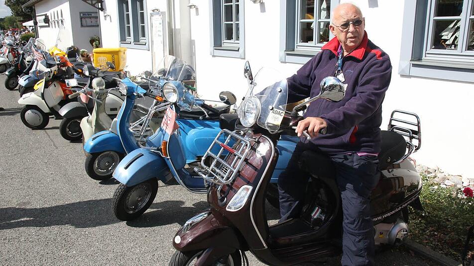 Hans Pfadenhauer aus Bad Staffelstein ist mit seinen 89 Jahren wohl einer der ältesten Vespa-Fahrer und seit 40 Jahren ein bekennender Fan des italienischen Kultrollers. Seit dieser Zeit hat er bereits fünf der bekannten italienischen Motorroller gefahren. Vor Kurzem hat er sich einen neuen Roller, natürlich wieder eine Vespa, zu gelegt. Und ist darauf ganz stolz. "Das ist ein Einspritzer mit 125 ccm, der fährt über 100 km/h." Er besucht fast jedes Vespa-Treffen und liebt besonders die Ausfahrten. "Der fährt wie einer mit 50 Jahren", sagen anerkennend die anderen Klubmitglieder aus den Vespa-Klubs Itzgrund und Bayreuth. "Vor der Vespa bin ich Motorrad gefahren. Andere Vespa-Fahrer haben bei mir die Leidenschaft geweckt. Das Fahren mit einer Vespa ist da ganz was Anderes, einfach ein tolles Gefühl und hält jung und fit", schwärmte Hans Pfadenhauer beim 8.