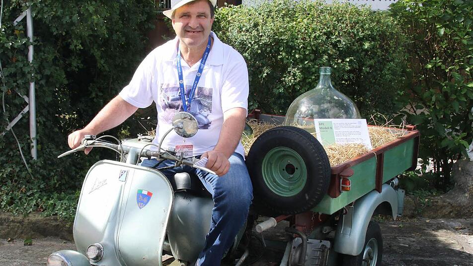 Des Öfteren fuhr Guiseppe Sanfilippo, der Organisator, der zusammen mit der Familie Franz Jahn und seiner Frau Andrea das Treffen auf die Beine gestellt hatte, mit einer alten Ape aus dem Jahr 1963 über den Platz. "Die habe ich letztes Weihnachten in Italien in einer Scheune bei einem Weinbauern entdeckt, der konnte aus Altersgründen nicht mehr fahren. Ich habe die Ape gekauft und nach Kaltenbrunn transportiert", erzählt Guiseppe Sanfilippo, der im Itzgrund unter dem Namen Josef bekannt ist.