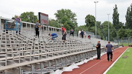 Die Vorbereitung im Stadion für das Bayern-Spiel laufen derzeit auf Hochtouren. Mehr als 30 freiwillige Helfer errichten drei Tribünen.
