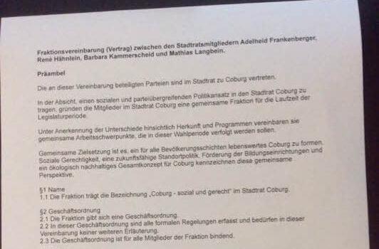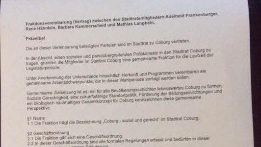 Vorsitzender der neuen Fraktion wird René Hähnlein. Er versandte im Vorfeld des Pressetermins eine Erklärung und auch ein Foto vom bereits unterschriebenen Fraktionsvertrag dazu - die neue Fraktion soll "Coburg - sozial und gerecht" heißen, abgekürzt vermutlich mit CSG.