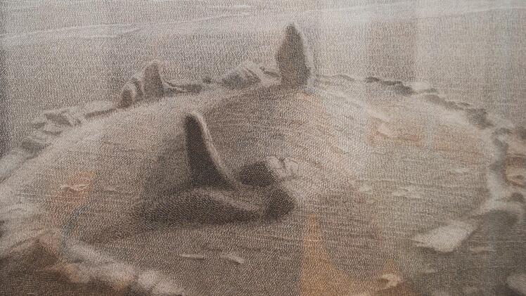 Schaut man trotzdem genau hin, erkennt man, dass diese Bleistiftwerke und Radierungen aufgebaut, verdichtet sind aus winzigen Kringeln; die Struktur des Sandes, die Unendlichkeit der Sandkörner bestimmt alles.