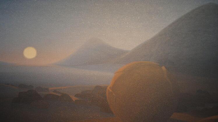 Pfeuffer lässt uns auf die Wüste wie durch geschlossene Lider blicken. Weil das, was er zu zeigen hat, sonst nicht erträglich wäre. Nur so kann der Blick gewagt werden in die uferlose Ferne, den leeren, leeren Himmel, gegen eine verglühende Sonne, auf die Schwärze gigantischer Felsformationen. Die Augen beschattet gegen die Gewalt des Lichtes.