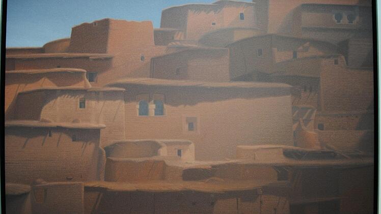 So wirken seine Braun-, Ocker- und Blautöne abgedämpft wie durch einen Schutzfilm. Oder durch einen Schleier alles überziehenden Sandes gesehen. Pfeuffer stellt mit seiner Malerei die Wüste her im Empfinden des Betrachters. Schauder mag einen überfallen.