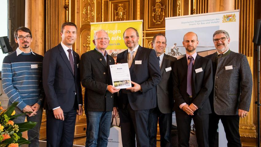 Neben einer Urkunde, überreicht vom Fürther Landrat Matthias Dießl in seiner Funktion als Vorsitzender der AGFK Bayern, darf sich die gesamte Gemeinde bald über einen neuen Fahrradständer freuen, der von der Firma Gronard zur Verfügung gestellt wird.