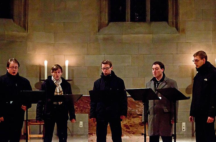 Und drinnen, in der winterlich frostigen Pfarrkirche St. Augustin, singt ein junges Vokalquintett aus Leipzig vor - sicherlich auch witterungsbedingt - überschaubarer Zuhörerschar mit faszinierender Klangkultur ein Adventskonzert, das sich jede besinnliche Anbiederung versagt. Sie nennen sich "Ensemble Nobiles" und sind allesamt ehemalige Thomaner.