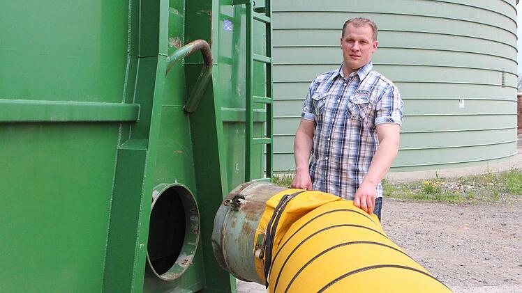 Ölheizung nur noch für Notfälle Größtenteils behalten die Nahwärme-Kunden von Sollmann ihre Ölheizungen, um diese im Notfall oder bei besonders niedrigen Temperaturen, zuschalten zu können. Aber ihre Wärme bekommen sie für 4,6 Cent netto pro Kilowattstunde von ihrem Straßennachbarn. "Das Potenzial ist vorhanden", sagt Sollmann und klettert die Leiter an einem großen Containern hinauf. Darin liegen Holzschnitzel, die er mit der Wärme seiner Biogasanlage trocknet. Große gelbe Schläuche leiten die Wärme in die Container, mehrere pro Woche kann er so bearbeiten. "Die getrockneten Holzschnitzel haben eine 30-prozentige Ersparnis gegenüber Ungetrockneten", erklärt Sollmann, der inzwischen wieder heruntergeklettert ist und einen der gelben Schläuche abmacht. Warme Luft, wie aus einem Föhn, strömt heraus.
